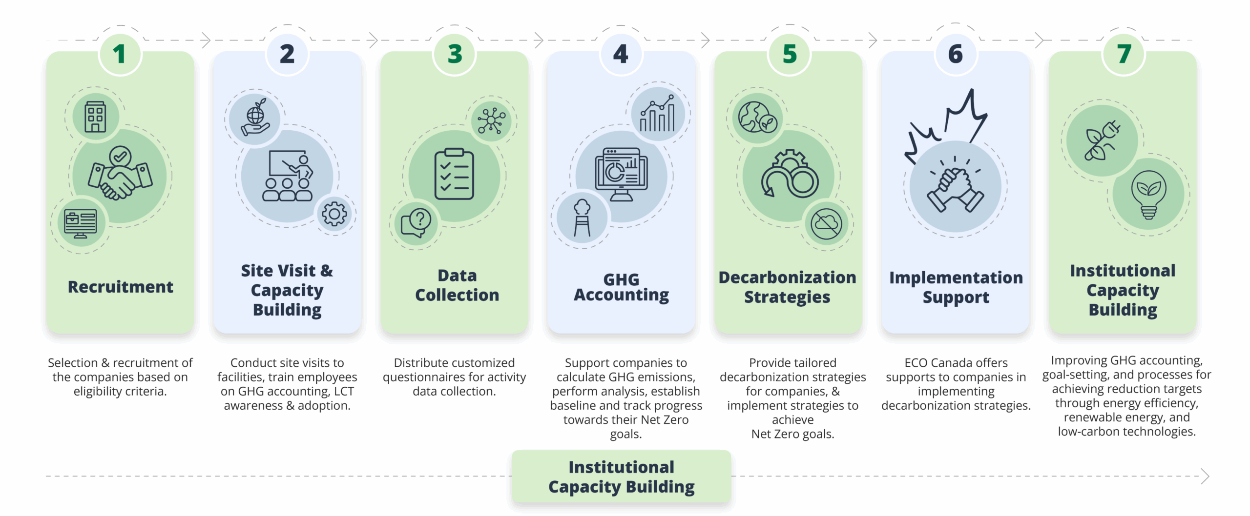 ECO Canada will work with organizations across Canada to engage and support them through the following phases to achieve their Net Zero goals: